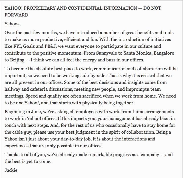 I read recently that Yahoo! has caused controversy by ending work-at-home arrangements. The anger from those affected resulted in the publication of this internal memo and the initiative was reported in “All Things D”. Don’t get me wrong, I am a big fan of working from home (that’s definitely one for another post), but the rationale for Yahoo!’s change in policy is fascinating, particularly in light of the type of company that Yahoo! is. It would seem from Yahoo!’s stance that they have made human contact and physical interaction a priority for on-going innovation. In this, it would seem that they acknowledge that the value of both informal and formal opportunities for collaboration is too great an opportunity for the company to miss out on, “We need to be one Yahoo!, and that starts from being physically together…Yahoo isn’t just about your day-to-day job, its about the interactions and experiences that are only possible in our offices”…interesting indeed.