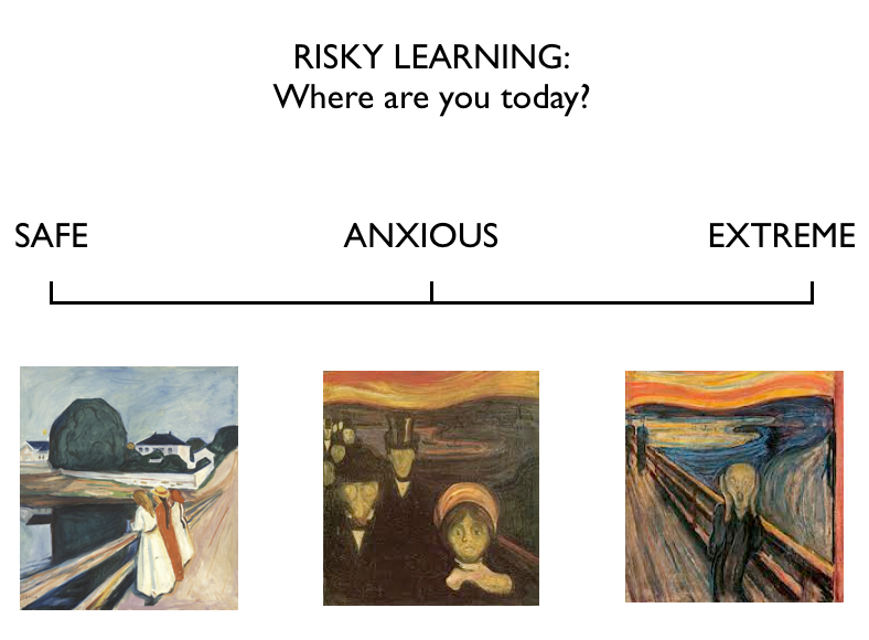Creating a continuum line of risk-taking is a helpful way of asking learners to assess what level of risk they are either (a) prepared to take in their learning and/or (b) have taken as part of their learning. Encouraging them to discuss what we actually mean and understand when we talk about taking a risk is integral to agreeing a set of qualities of risk taking behaviours that we would, as a group, either encourage or discourage.